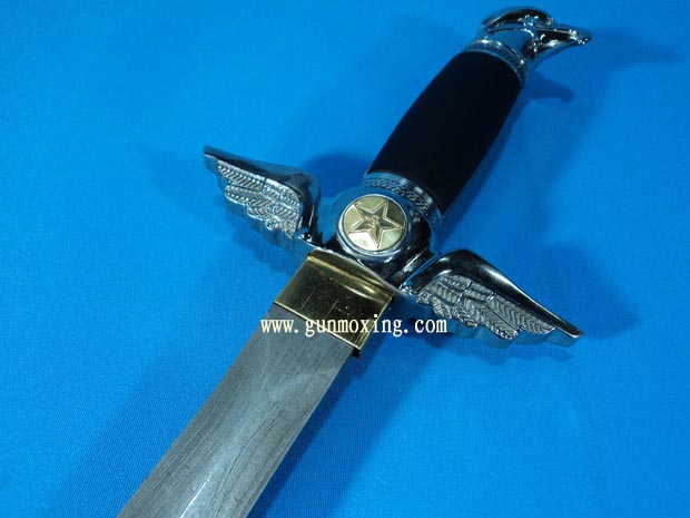 精英剑详细介绍: 精英剑,以鹰的艺术造型为基准设计,造型简洁大方,手感极佳,是实用与艺术的完美结合。 采用中国传统铸造工艺,由纯手工反复折叠锻打而成的花纹钢剑身,极具艺术美感,剑刃双面开锋,由于反复锻打,剑刃锋口钢质硬度高于剑身,及其锋利。手柄和护手采用不锈钢精密铸造而成,护手中间浮雕金色五星,手柄和剑鞘表面包裱高档羊皮,剑鞘采用不锈钢材质,运用模具成型工艺制作,表面精细抛光处理,剑鞘正上方镶嵌一颗鹰眼宝石。采用高档实木剑盒包装,附带陈列衬板。 剑是权力与荣誉的象征,精英剑更是军人励志、尚武精神的代表。 说明:本公司经营之礼品刀剑为礼品、收藏品,均未开刃。