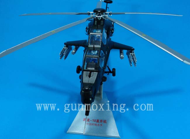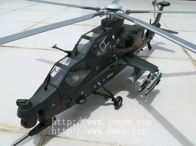 Z-10武装直升机是中国自主开发研制的第一款专用型武装直升机,以反坦克作战为主要任务,具有优异的作战性能,火力强大,航电系统先进,其总体性能达到国际先进水平。Z-10武装直升机全长约14.15米,高约3.84米,最宽处约4.35米,采国际流行的纵列式座舱布局,窄机身,后三点式防冲撞起落架; 主桨由5片全复合材料桨叶构成,直径约为12米,尾桨为4片弹性玻璃纤维宽叶。采用传统布局的Z-10武装直升机同美制RAH-66相比,不具备雷达隐身的气动结构,而是通过大量采用吸收雷达波长的复合材料和涂装来缩短被敌人发现的距离,同时也达到减轻飞机重量的目的。