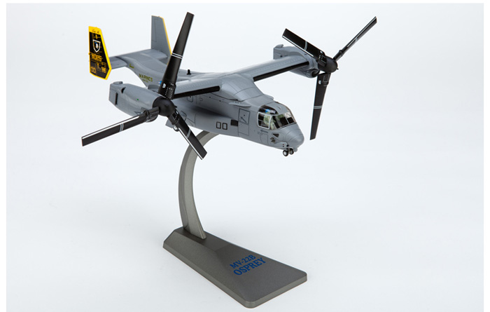 美国V-22飞机模型,制作材料为优质合金,按照1:72比例精确制作,飞机模型长度26cm、宽度23cm、高度(含底座)18cm,净重1.17kg。