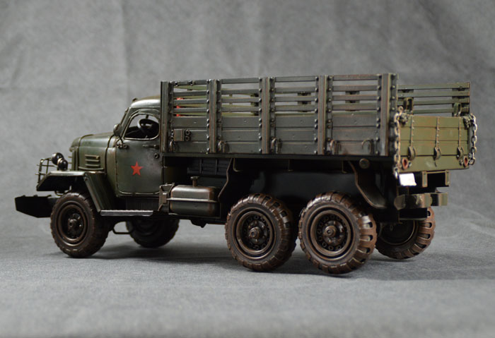 1956年解放卡车六驱越野版模型,为超详细制作铁艺收藏级模型,长宽高分别为40cm、16cm、16cm,车体的各个细节均详细做出,特体外的一每颗螺丝、每一个铆钉、车窗密封条、灭火器、车灯放撞罩、油箱细节、车厢板转动轴细节、后车厢铁链等,均详细如实做出,车体严格按照比例缩小制作,原车特体具有的每一个凸凹部分均如实做出。是一款非常值得珍藏的铁艺模型。