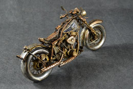 创意印第安摩托车模型,按照印第安风格制作,使用材料是马口铁,模型长宽高分别是34cm、12cm、15cm。此模型是超详细制作铁艺模型,摩托车的各个细节部分均制作出来,包括油箱细节、发动机细节、各个连接管路连接线路、减震弹簧、油箱上喷涂的图案、摩托车轮胎的各个轮条、车体上相应的铆钉、车把防滑纹、座椅材质细节等,均详细体现。车体进行了非常专业的做旧处理,真实感极强。此模型充分体现了印第安民族野性、豪迈的风格。