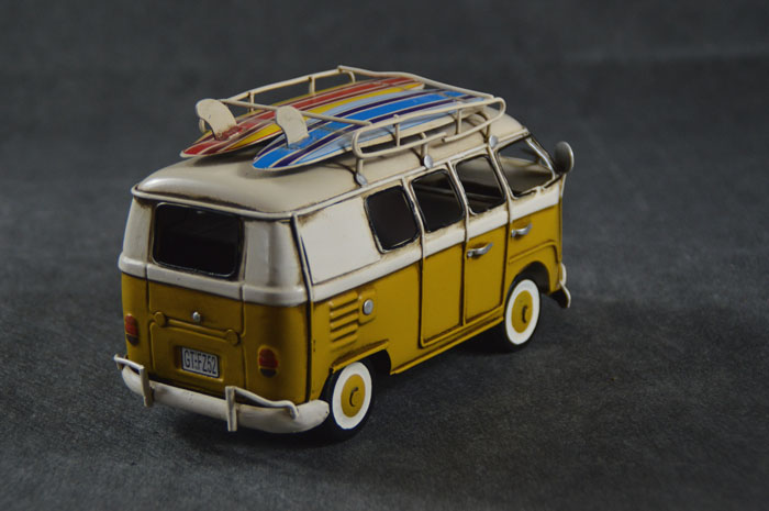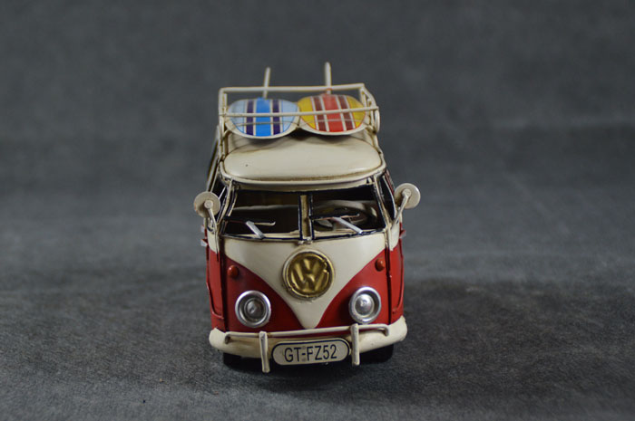 1950年3月8日,大众T1正式在位于西德狼堡总厂开始生产,大众T1的外观特征尤为明显,圆圆胖胖的车身线条,前脸的V字形凸起区域,硕大的VW标志、前大灯和两块分别可独立开闭的前风挡无不透露出非凡的个性。 此1957年大众T1小巴模型,原汁原味地还原了当时大众小巴士的真实状态,车体经过专业做旧处理,真实感非常强,车顶行李架配2个冲浪板,体现出了那个年代民众的实际生活状态。 模型为手工制作,制作材料是马口铁,长21cm、宽8.5cm、高12cm。
