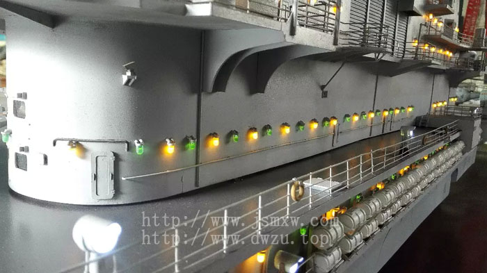 模型配置舰上灯光,灯光可以通过舰体上的控制面板选择点亮或关闭;舰体上的雷达可以电控旋转,通过舰体上的控制面板选择是否旋转。