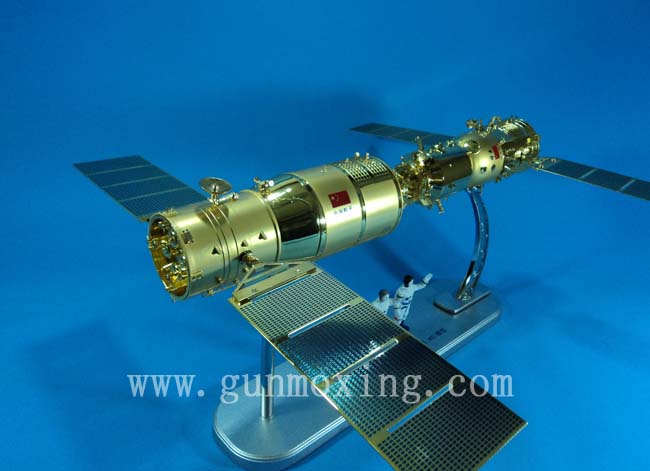 该模型为天宫一号/神舟九号载人飞船交会对接模型,模型由锌合金制造,长 46.5cm,高25cm,比例为1:40,能手动完成2个航天器的对接和分开,仿真度极高,可作为收藏品、礼品、教学、展品之用,模型含包装总重量4.75kg,包装为红色锦盒。